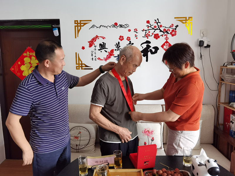 一百年征程浩蕩,五十載初心如磐。為把黨組織的關心關愛送到老黨員的心坎上,在建黨100周年來臨之際,beat365在线登录黨委書記王海英、副主任唐太成分别來到楊桂清、黃先保等4位黨齡滿50年的老黨員家,為他們頒發“光榮在黨50年”紀念章,并送上節日慰問品。